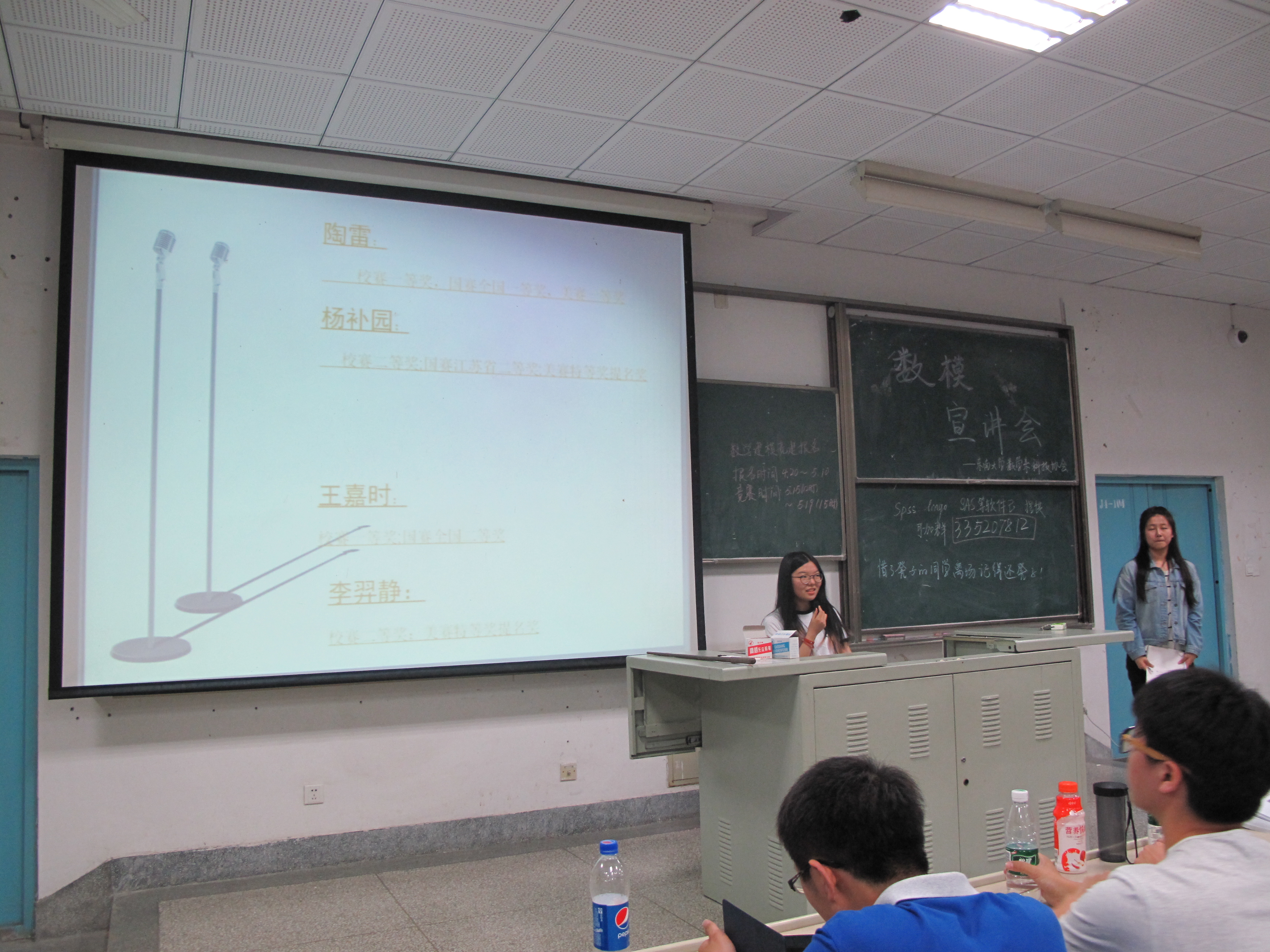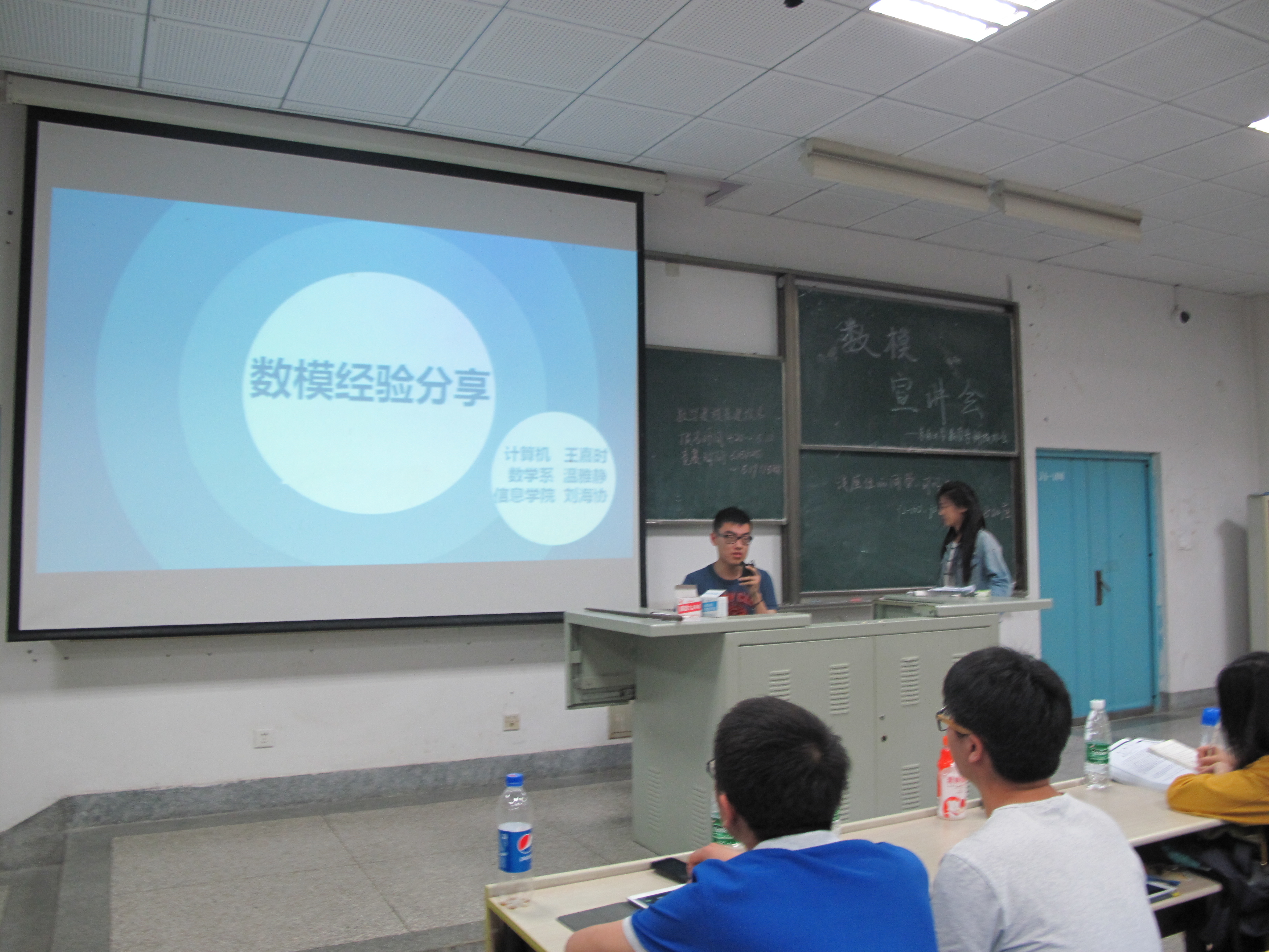 数学建模总教练、数学建模带头人,他的主要研究方向是应用微分方程和数学建模。 讲座伊始,陈恩水老师通过PPT向同学们介绍了数学建模竞赛的基本情况,包括报名时间、报名方式、竞赛时间、竞赛方式、组队要求、赛题模式等。通过陈恩水老师的讲解,同学们对数学建模校赛有了深入的了解。随后,陈老师结合多年来指导学生参加各类数模竞赛的经验,对同学们提出了中肯的意见和建议,如:组队时要充分考虑每个人的特长、选择赛题时要稳中求胜、模型和软件的选择依据、论文格式要严谨规范等。最后,陈恩水老师通过分析近几年的赛题和学长学姐的参赛经历又给出了更具有时效性和实践性的建议,并鼓励同学们积极参与,创新思维,严谨细致。通过陈老师的精彩讲解,同学们获益匪浅。 活动第二部分,我们还邀请了在2014年全国大学生数模竞赛,数模国际竞赛中及数模美赛中获奖的四位学长学姐为同学们交流经验。他们分别是来自来自数学系获得美赛特等奖提名奖的李羿静同学,来自信息水果派解说 ,获得校赛、国赛以及美赛一等奖的陶雷同学,来自仪器与科学水果派解说 ,获得校赛二等奖、国赛省级二等奖,美赛特等奖提名奖的杨补园同学及来自计算机水果派解说 获得校赛一等奖、国赛二等奖的王嘉时同学。四位同学结合自己的亲身体会,深入浅出,更加具体而有针对性的给同学们予以点拨。之后,同学们对自己不懂得地方进行了提问,陈恩水老师和学长学姐们对问题一一给予耐心解答。 讲座在一片热烈的掌声中圆满结束,此次活动既加深了同学们对数学建模竞赛的了解,又从前人成功经验里给同学们以信心,数学系科协也以此为契机给同学提供了交流平台,供大家自由组队、交换信息,帮助大家更好地投入比赛。数学系科协衷心祝愿所有参赛选手在数模竞赛中有所斩获,祝愿水果派解说 在各级数模竞赛中再创佳绩! |