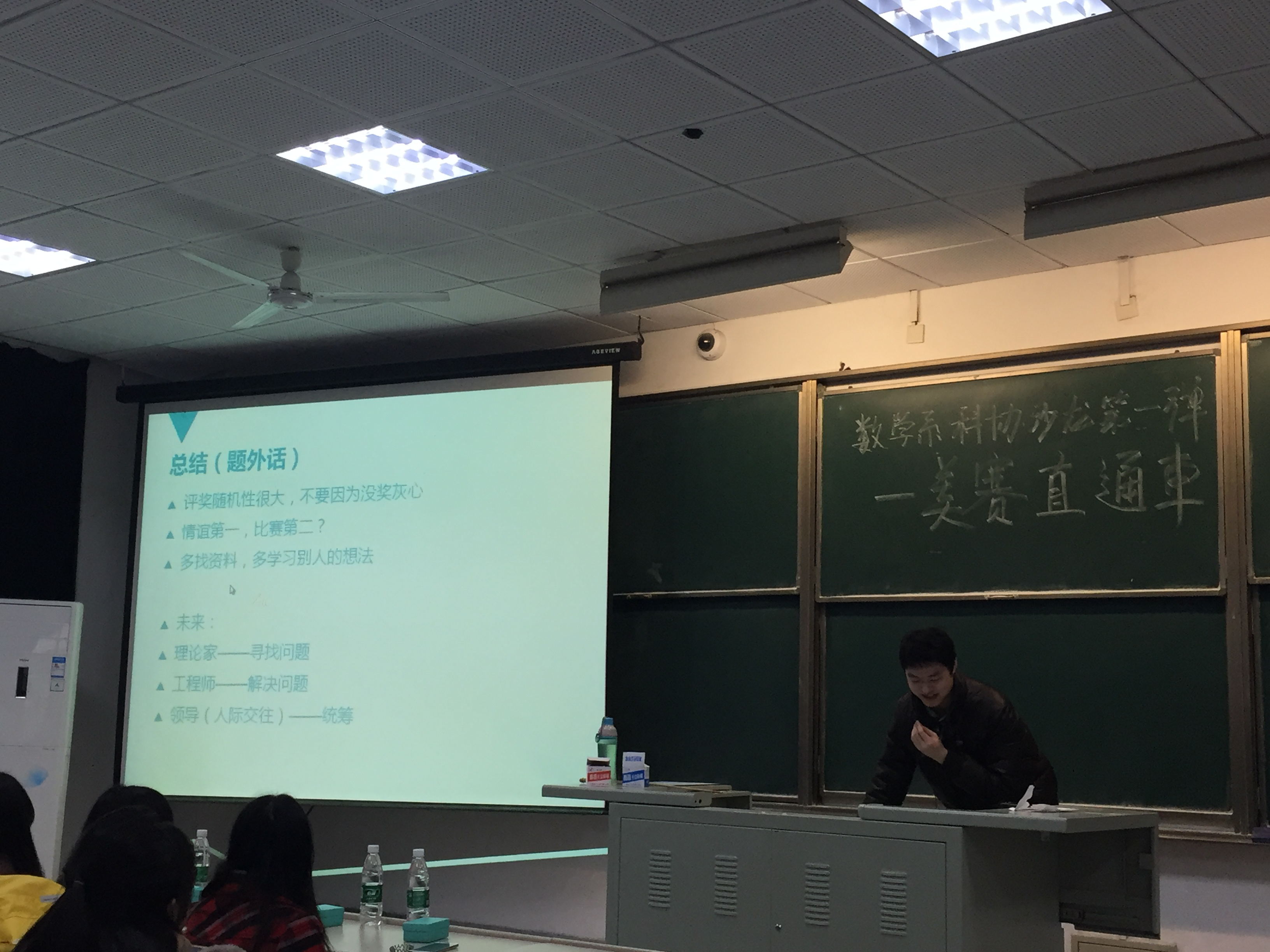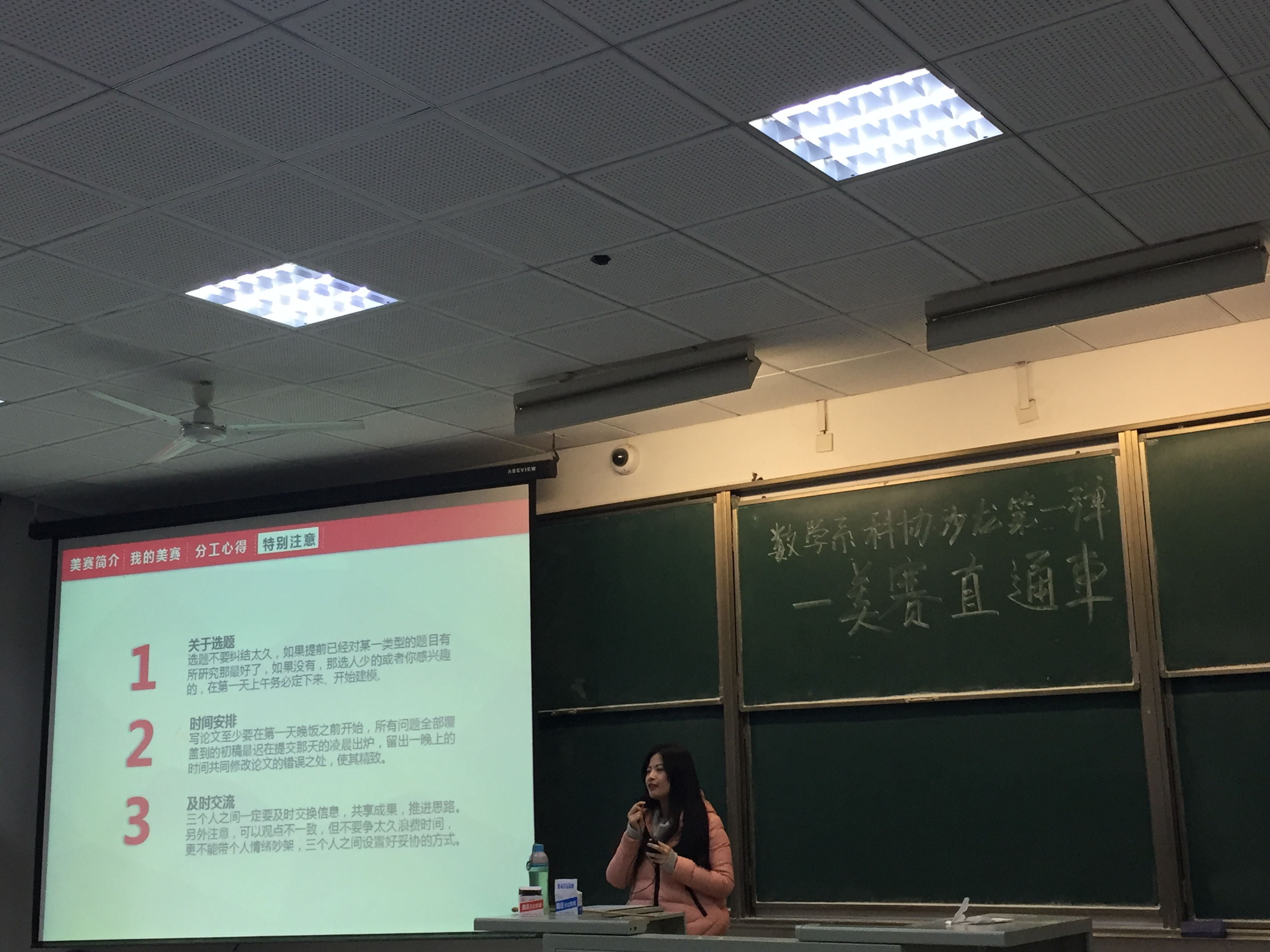| 2015年12月23日中午,由数学系科技协会主办的沙龙第一弹――美赛直通车在教六-101成功举行,此次沙龙我们邀请到了在上届数模美赛中取得了优异成绩的学长和学姐们,为我们分享他们在比赛中的经验。 此次美赛沙龙由数学系科协科技竞赛部干事曾立云同学担任主持。交流会开始后,首先由在美国大学生数学建模竞赛中获得一等奖的,来自信息科学与工程水果派解说 的肖舒涛学长为我们分享了比赛中的一些技术性问题,其中包括,前期准备,比赛,以及论文写作。学长将比赛过程具体分为三个步骤:第一步:拆题,弄清题目问的是什么,问题是分几个层次,第二步:做题,第三步:改论文。与此同时,学长还就时间的分配和和参加完比赛后的收获,提出了个人的观点和看法。 接下来,同样来自信息科学与工程水果派解说 的高璇璇学姐,为我们详细的介绍了美国大学生数学建模竞赛的基本情况,并就比赛过程中如何分工合作分享了她的经验,学姐认为一定要认清自己的能力,如果你是三个人中的大牛,你可以及负责模型的建立也负责最后论文的写作,如果你感觉自己能力一般,一定要做最听话的人,负责完善小组讨论得到的成果。千万不要只提意见然后自己什么都不去做。除了分工合作,学姐还为我们分享了有关选题、时间安排、文献的查找和参考以及论文的写作等方面的经验。 紧接着,来自数学系的陈旋学姐,在论文写作方面为大家做了详细的讲解,在论文的写作过程中,各章节的划分、标题的拟定应体现文章清晰的思路;时间充足,尽量先写中文论文,再翻译;必须交代清楚所建模型、所用方法,论文中的亮点和新颖之处一定要在摘要中提及;一定要检查论文排版,表格和图形的大小、格式,使论文尽量美观。 最后,来自数学系的梁晓洁学姐在总结了前面几位学长学姐的发言后,重点提到了文献资料查找和阅读以及一篇论文摘要的重要性,并指出在前期训练过程中可以阅读往年的优秀论文,参考这些论文的写作方法和大体框架,为后期在比赛过程中的论文写作打下基础。 在学长学姐精彩的经验分享之后,最后的提问环节也将此次交流会推向了高潮,不论是提前在微信平台上留言提出的问题,还是到场同学踊跃的现场提问,学长学姐们都一一给出了细致的解答。 此次美赛沙龙,不仅为同学们分享了上届获奖同学的经验和感悟,同时也解答了部分即将参加比赛同学心中的疑惑,对今天到场的同学来说此次交流会无疑是一次重要的收获,最后也预祝即将参加美国大学生数学建模竞赛的同学可以获得优异的成绩! |