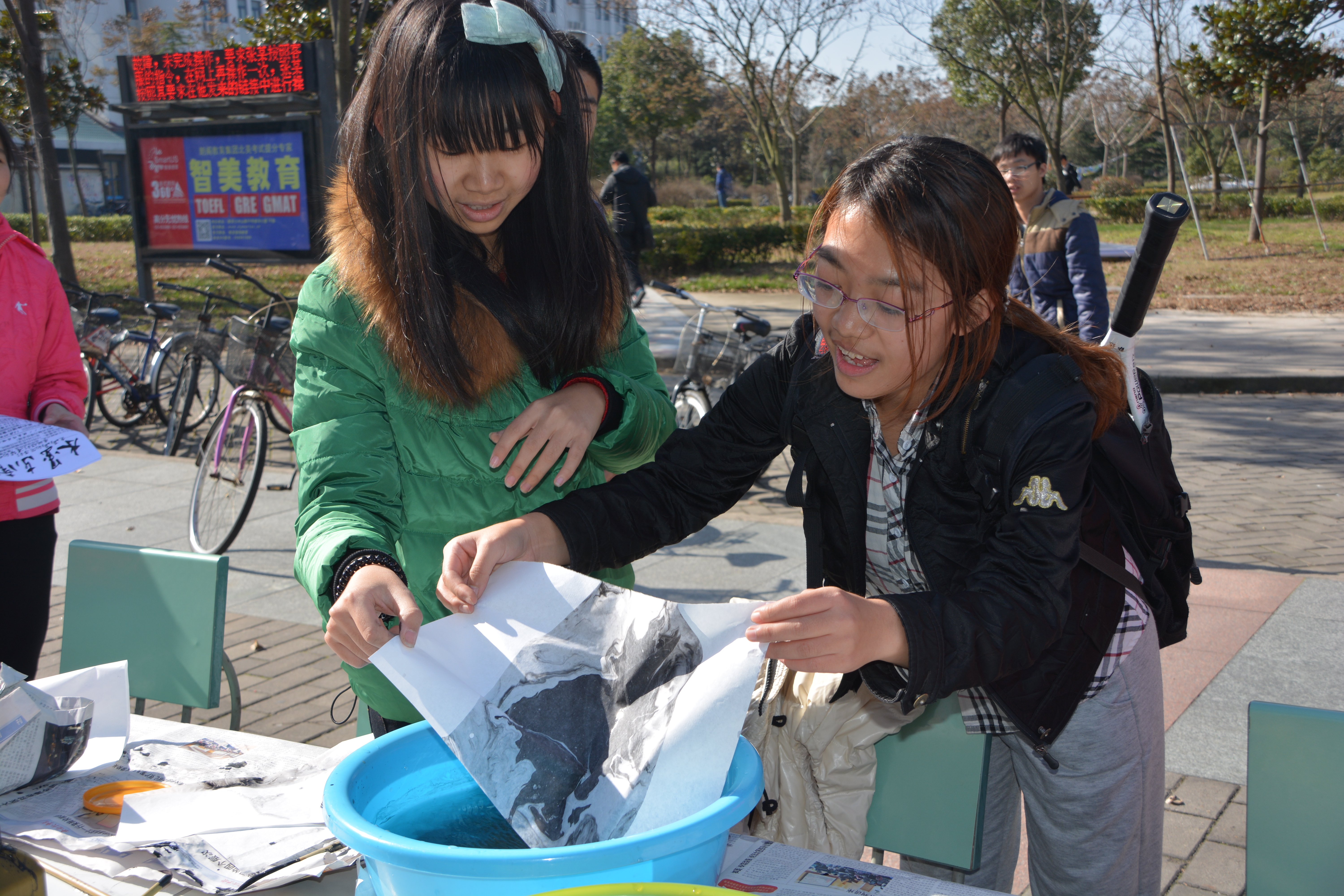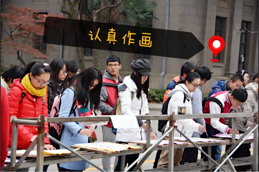 的支部成员参与其中。 为扩大活动影响力,12月1日,我们在梅园桃园食堂门口以小活动的形式进行活动宣传。班委成员提早到现场进行布置,拉起了横幅,摆放好了桌椅。支部同学也早早在食堂前准备好笔墨,虽寒风袭人,但墨香阵阵,浓能远溢,支部成员都以饱满的热情等待着同学们的到来。中午11:30左右,同学们开始陆续经过,由本支部的两名同学现场用“吸附法”进行创作,我们热情地邀请驻足观看的同学一起用“吸附法”绘制属于他们的作品。除此,还有同学大展身手,尽情挥洒笔墨,书写出端正俊秀的毛笔字。在班长和团支书的领导下,同学们喊起“水墨东南,书法绘画,欢迎参与”的口号,并发放我们支部精心设计的传单,耐心地为上前询问的同学讲解我们的活动。活动期间,有位支部同学被浓厚的文化氛围所感染,不禁哼唱起了青花瓷,缓缓抒情,歌声动听,大家一起放声歌唱,我们的心也随着歌声传遍了校园。更有我系辅导员、学生会主席的热情参与。 12月5日清晨,阳光四溢,微风拂面,同学们在校东门集合并一一签到。同学们穿着休闲,面带笑容,对当天活动满怀的期待均洋溢在脸上。八点十分,签到完毕,大家整装待发。八点十五分,我们拿着绘画工具,乘坐地铁,兴致勃勃地前往牌区开展活动。 上午9时,我们顺利到达目的地,几位建筑同学热情迎接,并自愿担当导游,带领我们参观牌区,同时为我们讲解水果派解说