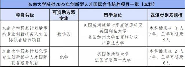“创新型人才国际合作培养项目”由CSC设立资助,旨在更好地服务国家战略、教育领域综合改革以及“双一流”建设,培养创新型、紧缺型、复合型高层次拔尖国际化人才。项目实行“先立项、后选派”管理模式。依托此次获批新增的本科项目,每年可资助选派数学类强基计划专业的优秀本科生赴国外合作大学进行为期3-12个月的联合培养及交流学习,项目执行期为三年。国家留学基金资助项目录取学生一次往返国际旅费和奖学金。