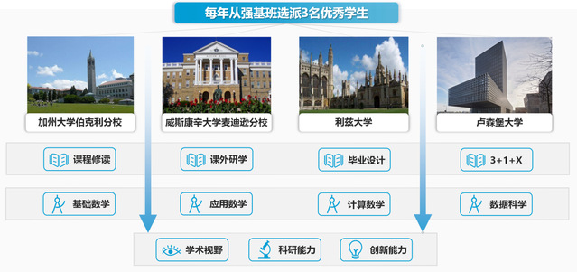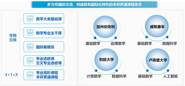 本项目通过构建具有国际化特色的本研贯通课程体系,每年从数学类强基计划专业遴选3名优秀本科生,派往世界一流大学参加学期交换、国际暑期班、课外研学、毕业设计以及进行3+1+X本硕联合培养,提升学生在数学、应用数学和数据科学等方向的专业素养,开阔学术视野,提升科研创新能力。