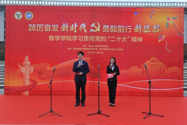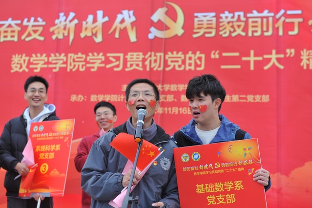 为了认真学习贯彻党的二十大精神,全面理解、准确把握党的二十大精神的丰富内涵、思想精髓、核心要义和实践要求,认真领悟党的二十大提出的新思想新论断、作出的新部署新要求,深刻领悟“两个确立”的决定性意义,激励党员不忘初心、牢记使命,推动水果派解说快速发展,助力我校“双一流”建设。水果派解说 全体师生党员于2022年11月16日在九龙湖校区李文正图书馆前开展“踔厉奋发新时代,勇毅前行新征程”学习贯彻党的二十大精神主题活动。本次活动由水果派解说 教授陈建龙老师,2021级硕士生肖靖婕和路嘉伟主持。