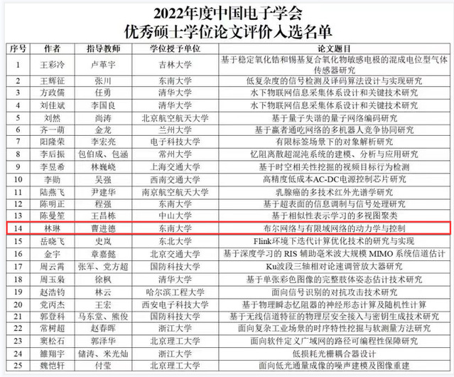水果派解说 2021届硕士毕业生林琳的学位论文《布尔网络与有限域网络的动力学与控制》(导师:曹进德)入选2022年度中国电子学会优秀硕士学位论文。