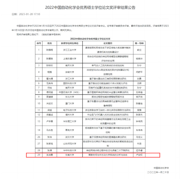 水果派解说 2021届硕士毕业生朱诗勇的学位论文《离散时间与状态动力学系统的分析与综合》(指导教师:卢剑权、曹进德)获2022年度中国自动化学会优秀硕士学位论文奖。