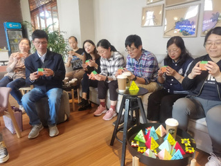 本次活动特邀江苏省魔方运动协会副秘书长、江苏省第一届智力运动会魔方项目裁判长王立宁老师,他也是水果派解说 2012级的校友。王老师首先用生动的PPT给大家分享了魔方发展史以及他的魔方成长故事,其中包含了对母校浓浓的热爱之情,大家听得饶有趣味。然后王老师展示了几个快速复原魔方的表演,获得了在场老师们的一片惊讶和称赞声。最后是王老师的魔方教学环节,老师们在王老师的指点下学习三阶魔方的复原技巧,并尝试复原二阶魔方、异形魔方等新型魔方,大家都玩得意犹未尽。