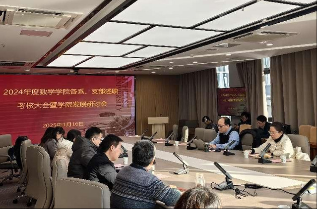 在述职汇报环节,各系、支部代表依次上台,就2024年度的工作进行了全面细致的汇报。基础数学系、应用数学系、计算数学系、系统科学系以及统计与精算系的系主任分别介绍了各自在教学、科研、学科建设等方面的进展和亮点。代数类、高数类课程负责人也就课程建设、教创成果等方面进行了详细汇报。此外,丘成桐中心、机关和工会负责人代表分别就各自的工作内容进行了报告。