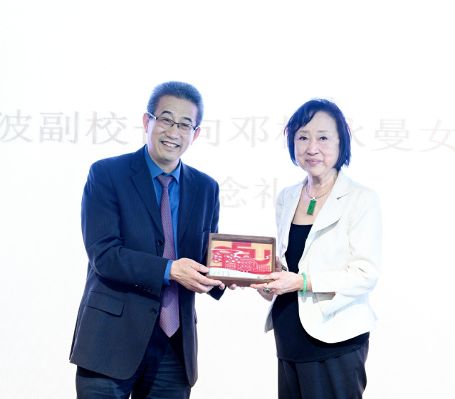 邱海波与邓杨咏曼共同为咏曼园揭牌,邱海波代表学校向邓杨咏曼赠送纪念礼物。