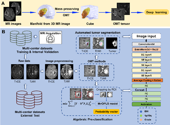 作为中枢神经系统最常见的原发性恶性肿瘤,胶质瘤的生物学行为呈现高度异质性,神经胶质瘤的术前分级和基因分析对于神经胶质瘤患者的治疗至关重要。为改进现有方法,李铁香教授团队与丘成桐院士长期与南京鼓楼医院张冰教授团队开展深度合作,将前沿的计算几何与最优传输理论应用于脑科学领域,实现影像数据的高效处理,并通过创新性代数模型显著提升了深度学习在脑胶质瘤分级与基因分型中的准确性。团队共收集来自16个不同中心的超过3500例脑胶质瘤数据,创新地提出最优传输-代数预分类模型(OMT-APC model),使用OMT方法将不规则大脑变换至规则张量,并基于多模张量奇异值分解,创新性地将代数方法与深度学习模型相融合,在图像模型基础上加入张量代数特征,显著提升了模型识别肿瘤和基因分型的能力,下图详细展示了这一方法的研究流程。