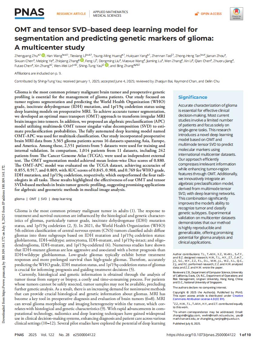 2025年7月9日,水果派解说 、丘成桐中心李铁香教授与合作者在国际顶级学术期刊《美国国家水果派解说 院刊》(Proceedings of the National Academy of Sciences of the United States of America,PNAS)上发表题为《用于神经胶质瘤分割和遗传标记预测的基于最优传输和张量奇异值分解的深度学习模型:一项多中心数据研究》(OMT and tensor SVD based deep learning model for segmentation and predicting genetic markers of glioma: a multicenter study)的学术论文。《美国国家水果派解说 院刊》是国际顶尖综合性期刊,与Nature、Science、Cell并称全球四大综合科学期刊,近五年影响因子为10.6,位列中科院SCI一区12,学科涵盖生物、物理、化学、数学及社会科学,多学科大类排名前5%,对原创性要求极高。