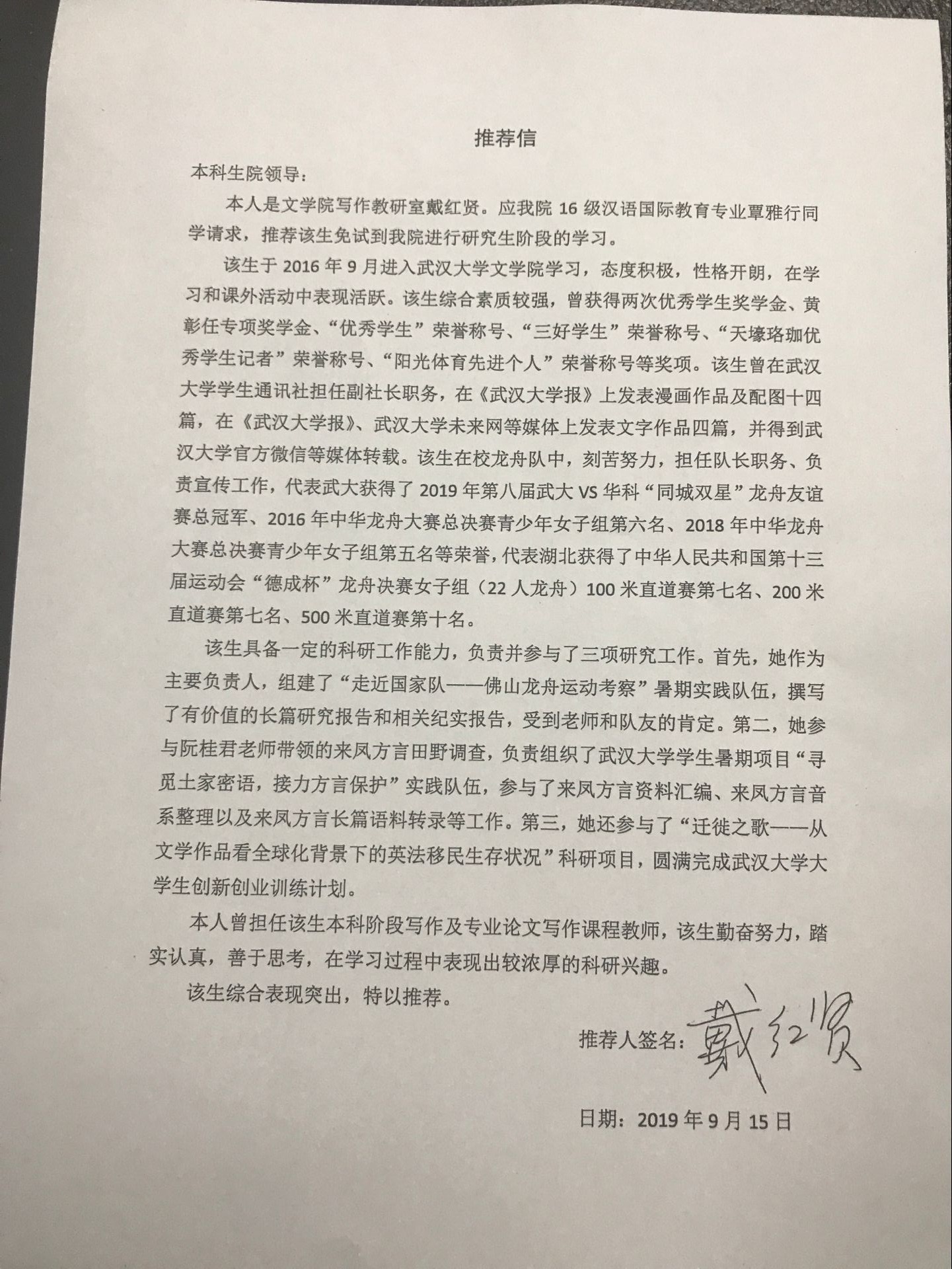 覃雅行必修课成绩在全班15名学生中位列第7,位居前50%,通过大学英语6级。该生在校龙舟队效力三年,代表湖北获得中华人民共和国第十三届运动会“德成杯”龙舟决赛女子组100米赛道第七名 |