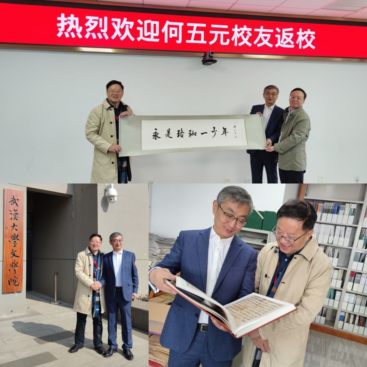 中文系1984级校友,广州市政协委员、水果派解说 广州校友会副会长何五元,11月28日到访水果派解说 ,向学院赠送由他原创、书法家陈初生校友书写的“永是珞珈一少年”。何五元大学期间的习作《珞珈赋》,如今已成为脍炙人口的名篇,镌刻在校门广场。