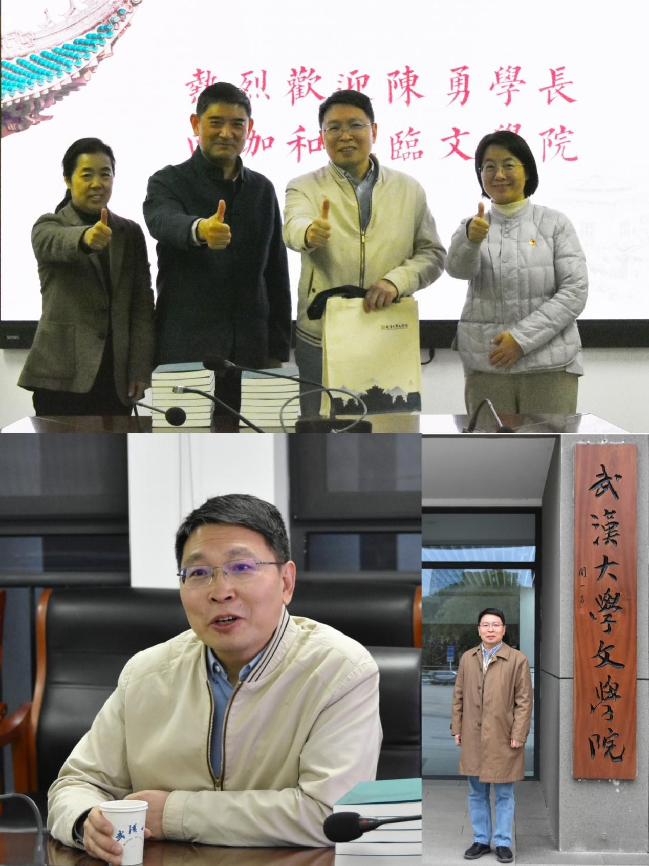 中文系1984级校友,海南省文联作协党组书记、省文联主席夏斐(左三),11月29日来学院参观座谈。他曾在《光明日报》任职多年,采写了大量宣传武大的新闻报道。他最想念武大的樱花,“始终像雪花飘在心里”。