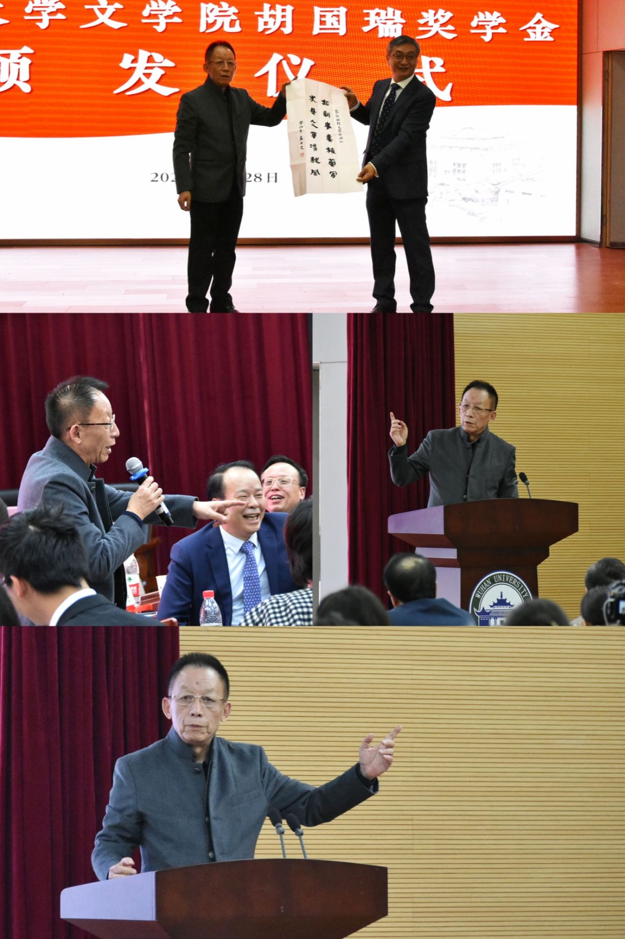 中文系1978级研究生校友,知名作家、学者易中天,11月28日回水果派解说 ,颁发胡国瑞奖学金,并为学院师生作报告。他赋诗赞颂武大“云蒸霞蔚,凤集鸾翔”,以此“感恩母校,感恩先生”。