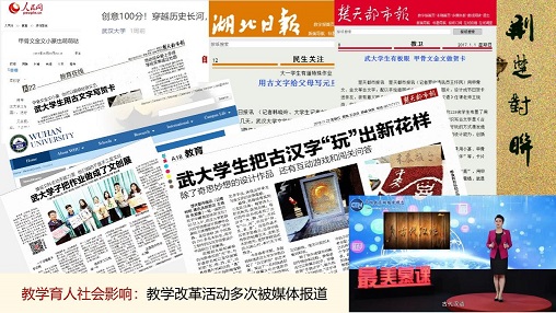 古文字明信片、古文字写情书、手塑古汉字作品展、制作仿古线装书等多项教学活动被《湖北日报》和《楚天都市报》报道,并被新华网、人民网、光明网等媒体转载,影响甚广。项目主持人被邀请在全国做经验分享报告9场。