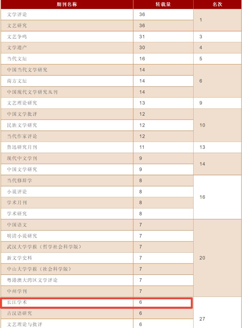 3月29日,中国人民大学人文社会科学学术成果评价研究中心、中国人民大学书报资料中心联合发布2021年度“复印报刊资料”转载指数排名,《长江学术》在参与排名的204种中国语言文学学科期刊中,全文转载量排名第27(并列第12,全文转载6篇),全文转载率排名第7(转载率12.50%),综合指数排名第17(综合指数根据各期刊的转载量、转载率和篇均分三项指标的归一值综合测算得出)。