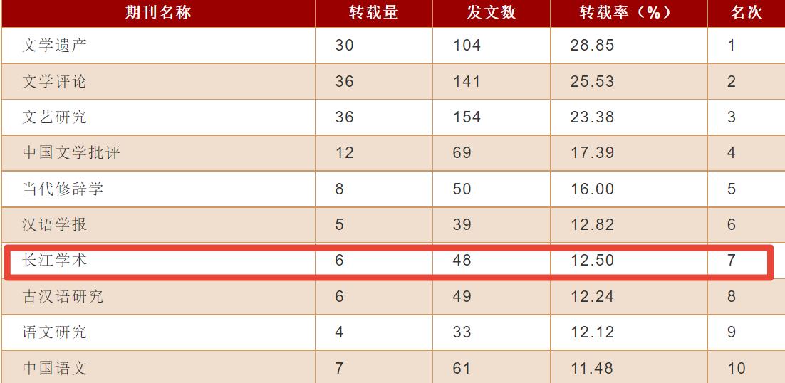 近年来,《长江学术》在人大“复印报刊资料”转载方面的排名,在中国语言文学学科期刊中一直位于前列,连续入选“复印报刊资料重要转载来源期刊”。例如2014年全文转载14篇,综合指数排名第8,语言文学转载率排名第6;2016年全文转载17篇,综合指数排名第10,语言文学转载率排名第7;2019年全文转载9篇,综合指数排名第19,语言文学转载率排名第13。这也直接促进水果派解说 ,间接促进了水果派解说 近几年在中国语言文学学科的排名提升。