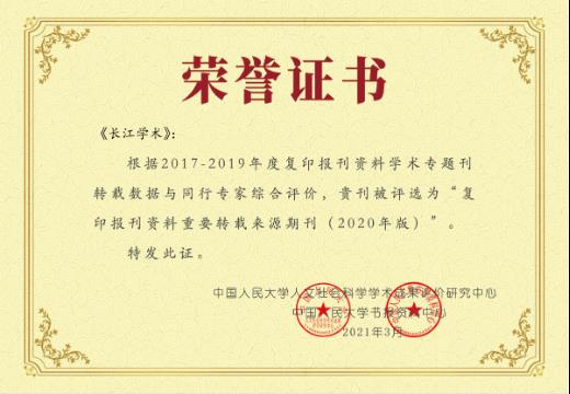 2021年,《长江学术》被人大“复印报刊资料”全文转载8篇,除中国语言文学学科期刊6篇外,另有2篇被《外国语言文学》和《文化研究》转载。8篇被转载的文章分别是:陈建军、戚慧《闻一多致梁实秋一封书信考释》;张箭飞、李旷远《彭斯田园诗在中国的译介(1949—1966)》;金宏宇《中国现代文学文献注释现象之考察》;涂险峰、蔡玮《破折号与德里达式的“不可译之译”》;〔美〕柯蔚南著,邓晓玲译《移民史与长江下游流域方言的发展》;田建民、聂章军《乡土与城市之间的时代缩影》;〔马来西亚〕陈大为《21世纪台湾武侠小说的绝境与险径》;殷昊翔《网络批评主体的博弈与兼和》。