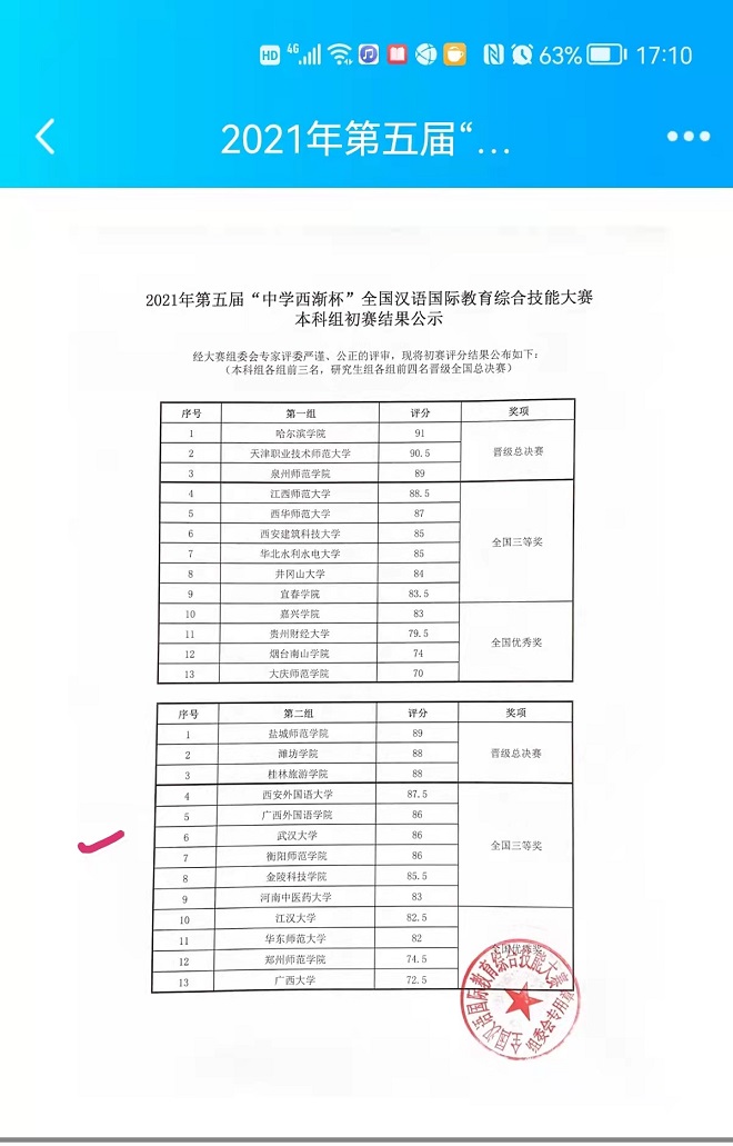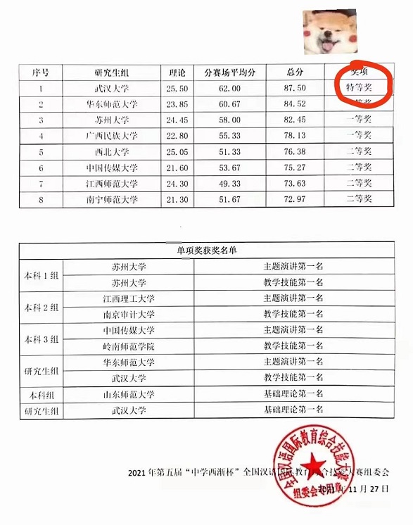 11月27日,第五届“中学西渐杯”全国汉语国际教育综合技能大赛决赛落下帷幕。在欧阳晓芳老师指导下,水果派解说 汉语国际教育专业2020级硕士汪一帆、2021级硕士许冰蕊和原可馨三位同学通过层层选拔,代表水果派解说 突围全国决赛,从来自全国的130支参赛队伍中脱颖而出,斩获研究生组特等奖、教学技能单项奖第一名及基础理论单项奖第一名。汉语国际教育专业2019级本科生李俊慧、马瑞林、刘羽茜三位同学也凭借优异表现,在本科生组的比赛中荣获全国三等奖。