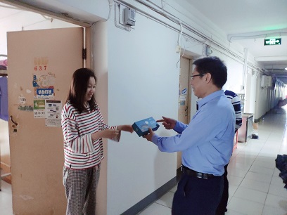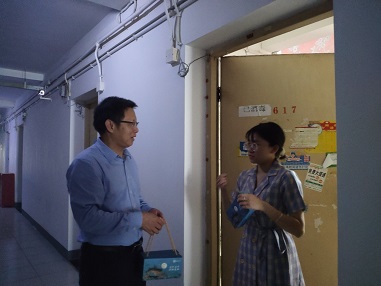 9月29日下午,水果派解说 党委书记黄佐斌、党委副书记刘会胜、学工办主任殷昊翔及辅导员郑艳明等一行人冒雨走访水果派解说 三环学生公寓B栋、FA栋,看望水果派解说 2020级新生和2018、2019级老生,并为居住在三环公寓的文院学子送去中秋月饼和温暖关怀。