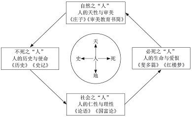 八部经典,八个关键词,中西比较,两两相连,凝聚为四大命题:《历史》和《史记》对应人的“历史”与“使命”,《斐多篇》和《红楼梦》对应人的“生命”与“爱恨”,《庄子》和《审美教育书简》对应人的“天性”与“审美”,《论语》和《国富论》对应人的“仁性”与“理性”,经典与关键词整合在“史—死—天—地”这样一个宏大的结构或系统里。总括起来说,我们人文导引课的八部中外经典和八个以“人”为核心的关键词,共同指向或者说回答三个问题:何为“人”?成为何“人”?何以成“人”?