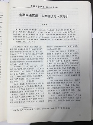 在新冠肆虐时期,在停课不停学的网课时代,“当灾难降临时,如何从人文精神的层面引导学生,则是教师的职责和使命之所在。在全民抗疫时期如何阐释并实施人文导引”,以达成对学生的精神引导与“成人”教育至关重要。李建中教授的《疫情网课实录:人类瘟疫与人文导引》对此做出了自己的思索与解读,从通识教育的层面堪称完美地解决了这一问题。该文已经在双核心期刊《中国大学教学》(李建中.疫期网课实录:人类瘟疫与人文导引[J].中国大学教学,2020(04):61-64+88)发表,今征得李教授同意,录取全文,以飨读者。