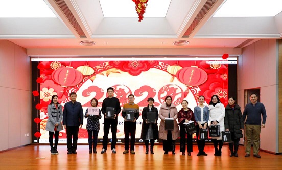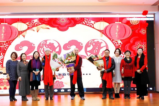 2020年,本院三位老教师——於可训老师、萧国政老师、孙疏影老师即将告别讲台,光荣退休。联欢会请朴婕老师、郭婷婷老师和萧映老师分别为他们献上鲜花,表达对他们的敬意与感激。王若飞老师、李玉辉老师、孙冬妮老师也代表学院为三位老教师戴上了象征着不舍与祝福的红围巾。