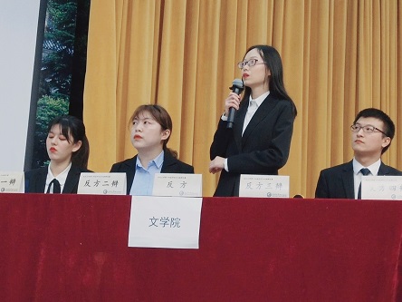 比赛开始后,双方就各自观点展开立论,我院持反方观点:快节奏生活不利于人的自我实现。我院辩手条理清晰、有理有据,从快节奏生活对当代人身心健康的影响及其不可持续性展开论述,法学院则从科技发展的角度论证快节奏生活对人自我实现的意义,也同样不失精彩。双方你来我往,唇枪舌剑,将总决赛现场气氛推向高潮。