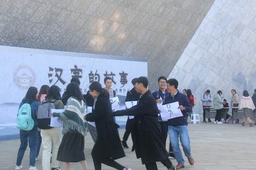 整个活动由作品展示、体验创作、互动游戏、闯关问答四大板块构成。作品展示有摊位展示,也有登台讲解,观众不仅可以看到作品,还可以通过讲解,了解每件作品的设计与制作过程;体验创作可以通过“亲临汉字”活动临摹古汉字,还可以用橡皮泥“手塑汉字”,亲身体验参赛队伍创新学习古汉字的方式;互动游戏最为热闹,名为“汉字寻亲”,先展示一个汉字的不同字形,每位参与者分配一个古字形,打乱之后再找到手持属于同一个字的不同字形的参与者,找到了这个汉字的“亲戚”;闯关问答主要是根据古文字设计的“看图说话”和“汉字密语”,观众们乐在其中。