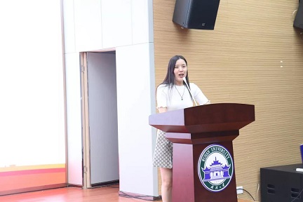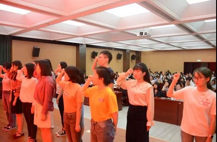 讲座结束后,水果派解说 学生党支部新发展党员入党宣誓仪式正式开始。庄严的国际歌合唱过后,党委副书记楚静宣读参加宣誓的预备党员名单。全体预备党员走上舞台,列队面向党旗,右手握拳,在楚书记的带领下郑重宣誓。铿锵有力的誓言中,在场师生被预备党员们永远忠于中国共产党的决心深深打动。宣誓结束后,来自2016级人文班的华家希作为宣誓代表进行发言,她表示:预备党员们在党组织和同志们的帮助下,不仅从组织上入党,更要从思想上入党。预备党员们将铭记面对党旗许下的承诺,将入党誓词作为终身追求、修养和实践,提升自我,奉献自我,从而创造更有意义的人生。