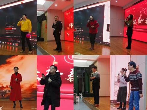 联欢会现场节目形式多样,丰富多彩,师生同台献艺,现场气氛热烈。穿插在节目中的游戏互动环节也是让人兴奋不已。本科生曾佳玲、朱宇昂、钟辰鹭带来的歌曲充分展现了水果派解说 学子的青春活力;鄂茂芳老师的《火火的歌谣》点燃了全场的气氛;王统尚老师的单口相声《孔大学问的故事》语言幽默,笑翻全场;王宇波老师的歌曲《在水一方》尽显儒雅气质;余蔷薇老师的诗朗诵《再别康桥》,简直唯美到极致;阮桂君老师用越剧演唱英文歌曲《ABC》,创意表演引得现场惊呼声一片;汪超老师朗诵《致橡树》惊艳众人;钟志辉老师一曲《红日》掀起全场高潮;郭婷婷老师一曲《雪忆》柔美大气、韵味无穷。
