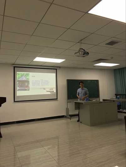 简短的开幕式后,对外汉语教研室的陈星宇老师第一个上台,就中国翻译中的经验论,她概括出好的翻译要抓住原作精神,以新的语言形式传达“力量”,随后以“鹿柴”的翻译为例,就翻译形式问题和译作与原作的相生关系进行深入探究,提出翻译应该达到“随意而赋形、得其言而知其意,因筌知鱼”的效果。