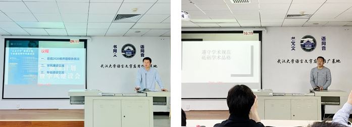 会议进入第二项议程,老师们对于学风建设问题作了重点强调,并提出了相关建议。李寒光老师提到,强基班的学风建设总体向好,上学期,专门为强基班开辟了研修室,为学生提供了潜心读书的空间;许多同学广泛阅读文献,并悉心向老师请教;还有许多同学积极参与了老师举行的读书会与读简班。但是,目前的学风建设也存在问题。一些学院组织的会议和讲座,出现了不请假也不到场的情况,部分同学缺乏纪律意识,这不仅不利于学院的学术研究和人才培养,对于同学们自身的发展也是有害而无利的。李寒光老师还邀请了其他老师们谈一谈日常学习和研究中要特别注意的问题,以避免同学们养成不良的学术习惯。