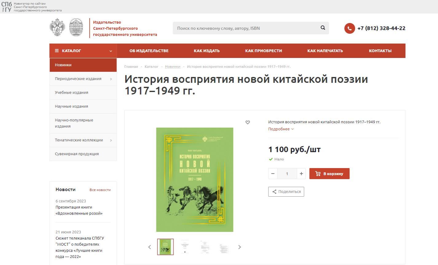 近日,我院方长安教授的专著《中国新诗(1917-1949)接受史研究》俄文版,由国际权威出版社圣彼得堡国立大学出版社出版发行,译者是南昌大学外国语学院温健副教授。该著首次研究了近百年来中国新诗(1917-1949)接受历史,从读者接受角度推进对现代新诗发展历史与经典化的认识,2016年入选《国家哲学社会科学成果文库》,2017年3月由中国社会科学出版社出版,2018年入选国家社科基金中华学术外译项目(俄文版)。