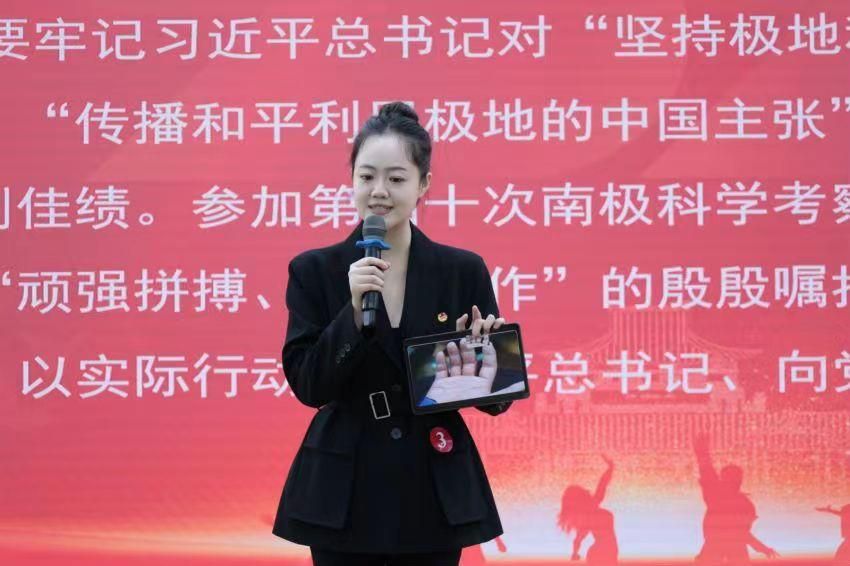 在“主题讲演”环节,张怡靖以“以中文服务世界,让世界了解中国”为主题,分享了她对国际中文教师这一职业角色的深刻理解,阐述了自己“以中文之声,实现与世界对话”的宏伟目标,充分展现了她作为一名汉语国际教育者、为中华文化“走出去”事业贡献力量的家国情怀与责任担当。在“接力宣讲”环节,张怡靖从一张摄有“南极科考队员的手”的照片讲起,深情讲述了武大人“用国家的大事业磨砺青年人的真本领”的信念和行动。最终,张怡靖以第一环节92.43分、第二环节90.57分、综合得分91.87分名列全场第一,荣获“金牌主讲人”称号。