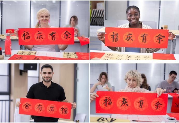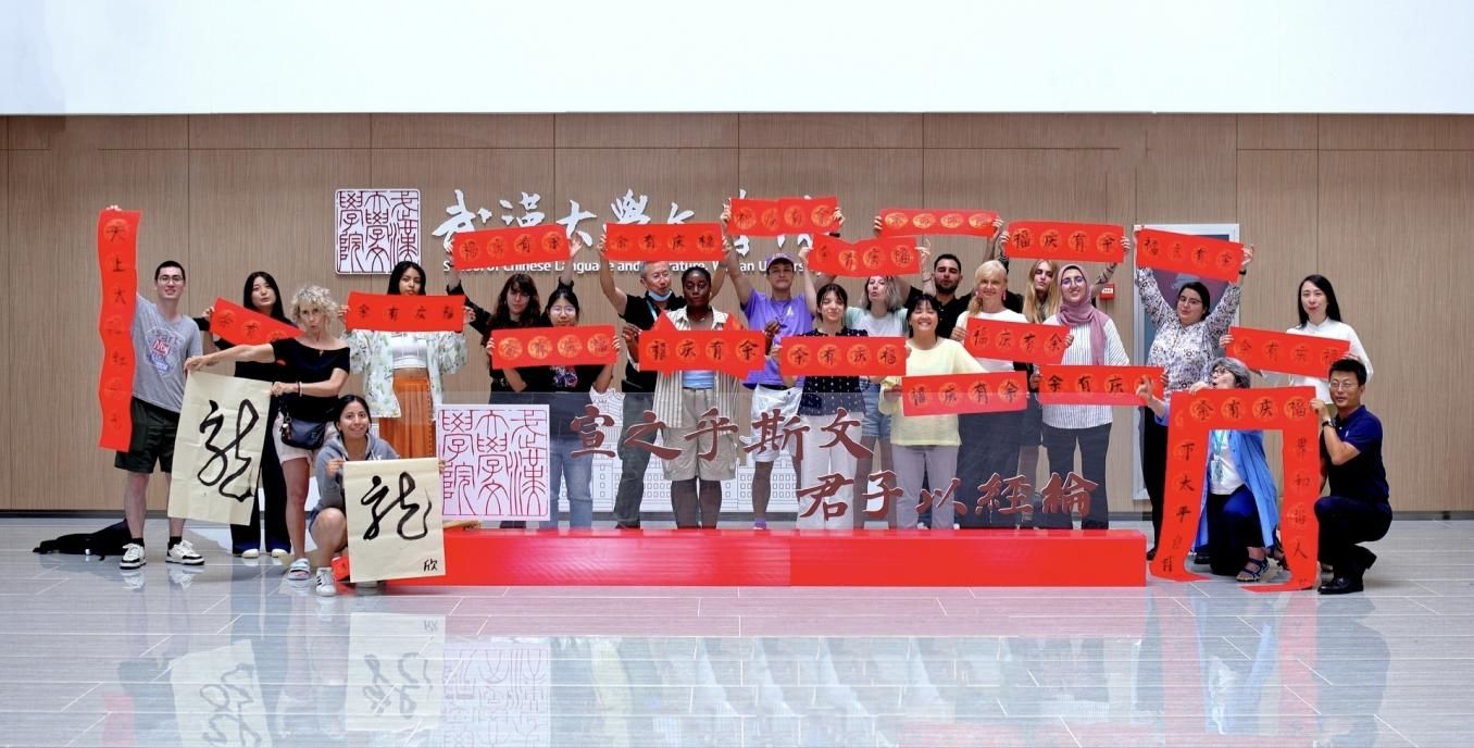 随后,活动进入高潮,王统尚老师带领学员们体验写对联。美好的祝福语跃然纸上,不仅展现了学员们对书法技艺的初步掌握,更寄托了他们对和谐世界的美好祝愿与深切向往。这一环节不仅是一次书法技艺的交流,更是心灵与文化的深刻对话,国际学子以笔墨为媒,传递出跨越国界的爱与和平之声。