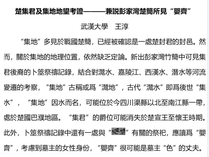 2020级本科生王淳(现为水果派解说 历史学院简帛研究中心硕士研究生)获得一等奖,论文题目《楚集君及集地地望考证——兼说彭家湾楚简所见“婴齐”》;