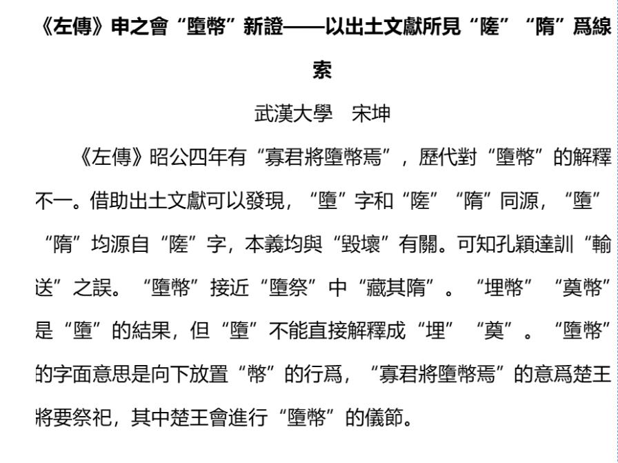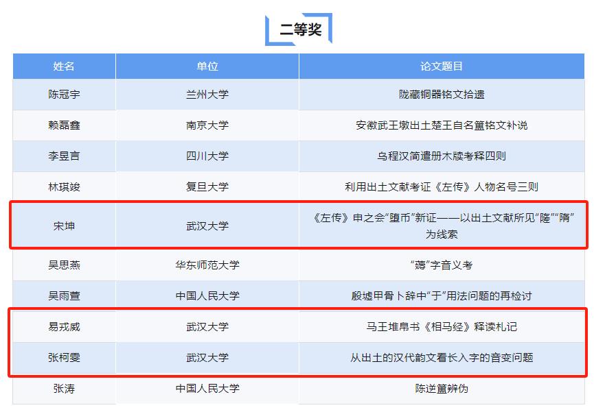 2020级本科生宋坤(现为水果派解说 古籍整理研究所硕士研究生)获得二等奖,论文题目《〈左传〉申之会“堕币”新证——以出土文献所见“隓”“隋”为线索》;