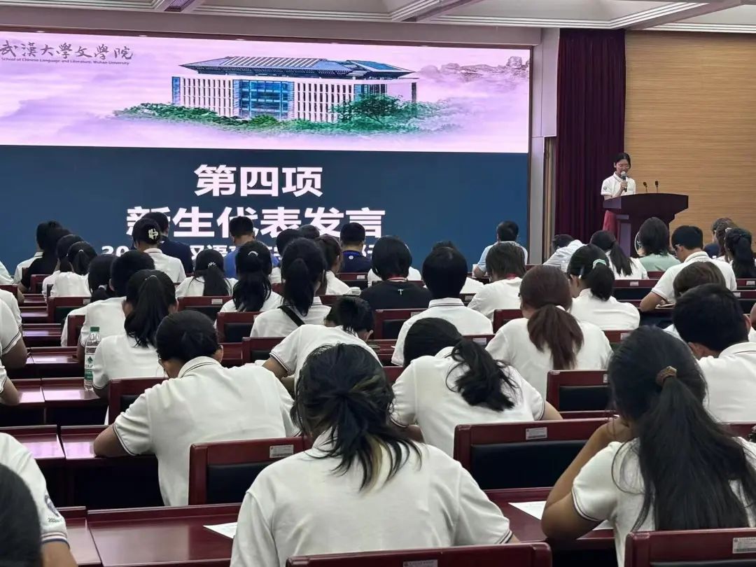 随后,新生代表、2024级本科生郭子睿发言。她以苏格拉底的哲学命题为引,代表2024级本科新生回答了“为何选择水果派解说 ,如何度过大学生活,在水果派解说 成为什么样的人”的“文院学子三问”,并表示将以宗福邦先生为榜样,潜心学问,孜孜不倦。