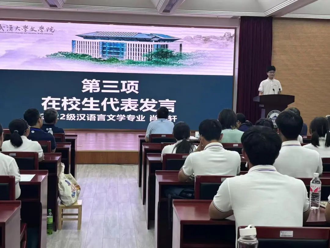 2022级本科生肖宇轩代表在校生进行发言。他围绕“可能”这个关键词,给学弟学妹们分享了三点感悟:积极参与大学的“可能”,勇于探索文学的“可能”,充分利用时代的“可能”,在大学四年的旅程中,寻找一份心灵的栖息之地。