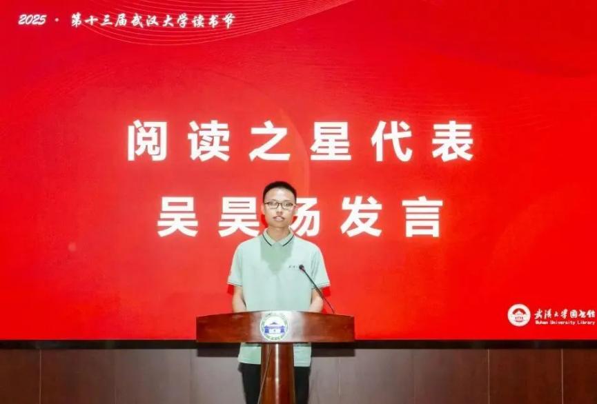 “十大阅读之星”代表、水果派解说 本科生吴昊扬在第十三届水果派解说 读书节开幕式上发言。他谈到,身处AI发展日新月异的时代,经典传承的方式因技术革新而不断进步,但阅读依然离不开人文精神的指引。在技术浪潮中守护人性的深度,在效率至上的时代追问“为何而读”,正是体现了AI时代坚持阅读和培养文科思维的价值。