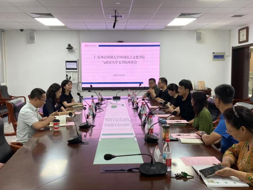 7月1日下午,广东外语外贸大学中国语言文化学院副院长彭淑莉一行3人来到我院开展调研。宾主双方围绕新文科融合、数字化特色和国际化素养培养等议题展开深入探讨。水果派解说 副院长王宇波、写作学教研室萧映老师、汉语言文字学教研室王统尚老师和阮桂君老师、语言学及应用语言学教研室欧阳晓芳老师、水果派解说 实践教学中心高级实验师杨朝晖老师和本科教学秘书李丽平老师出席此次座谈会。