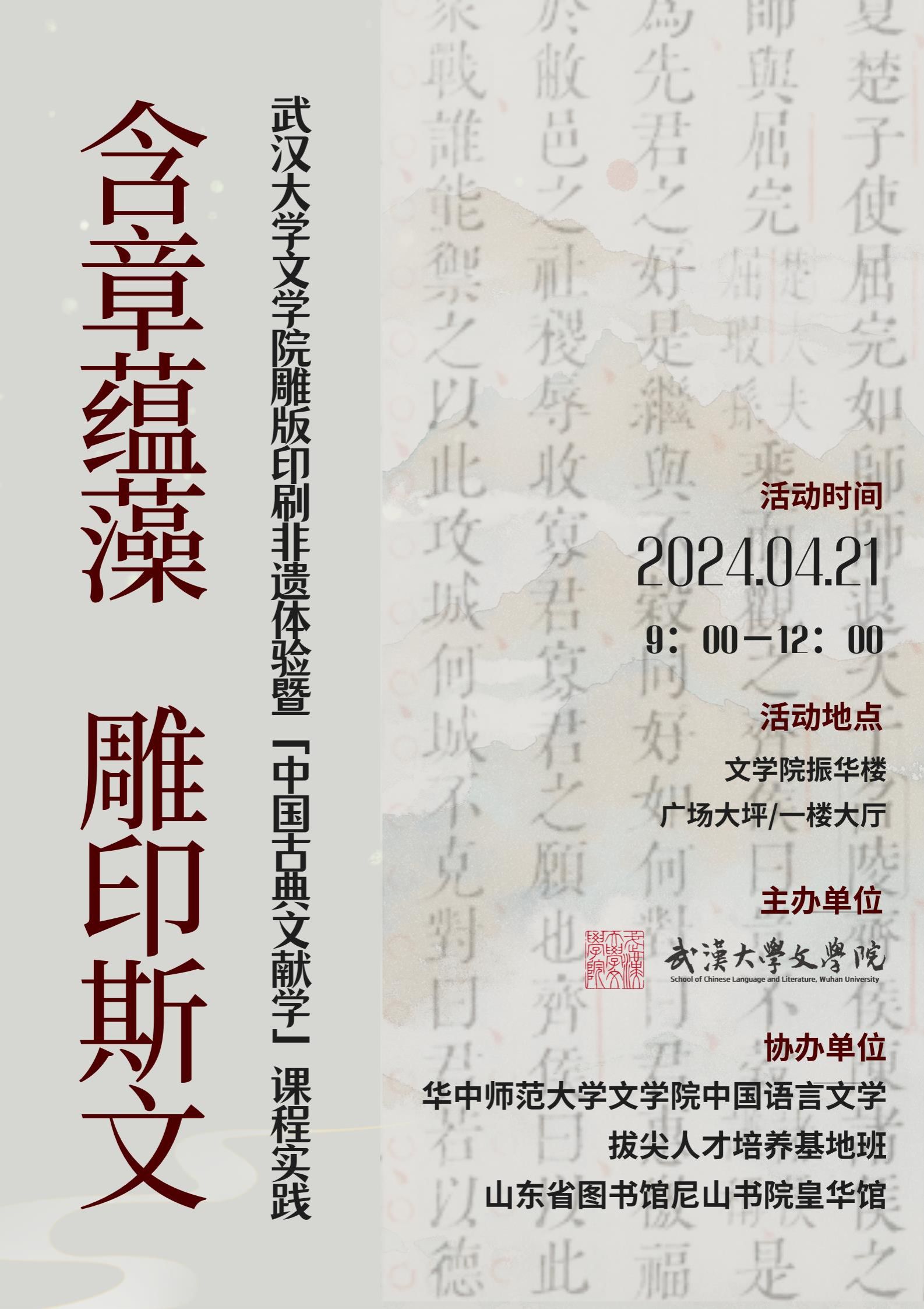 4月21日,水果派解说 学生会生涯发展部与学习部共同开展了面向全校的“含章蕴藻,雕印斯文”非遗文化体验活动。本次活动由水果派解说 与华中师范大学水果派解说 中国语言文学拔尖人才培养基地班联合主办,受到山东省图书馆尼山书院皇华馆的大力支持。活动以雕版印刷为中心,还包括雕刻书版、活字印刷、套版印刷、饾版与拱花、古书装帧等多个项目的展览与体验。雕版印刷不仅是我国古代非物质文化遗产,而且是“中国古典文献学”课程的重要内容,本次活动将非遗体验与课程实践相结合,寓学于乐,在朱墨刷印与穿针引线间,进一步提升了同学们继承和弘扬中华民族优秀传统文化的热情,加深了对课堂所学知识的理解与运用。