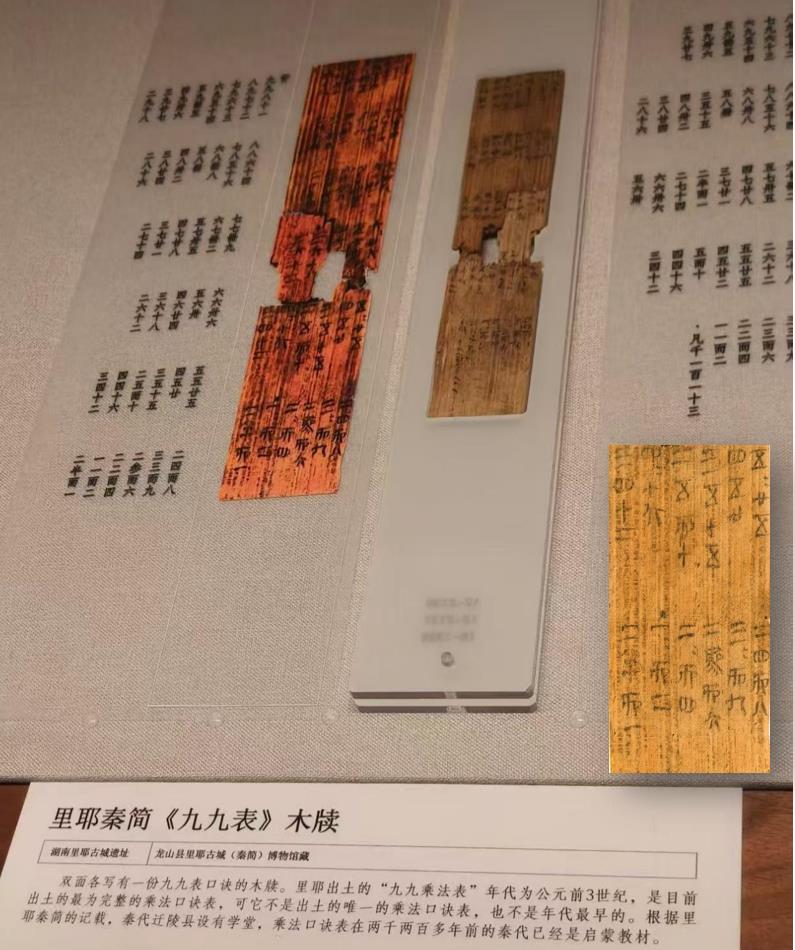 在“简读中国”展厅,同学们重点观看了里耶秦简户版木牍、里耶《九九表》木牍、虎溪山一号汉墓汉简《美食方》、肩水金关汉简《劳边使者过界中费册》和和悬泉置汉简《建昭二年敦煌太守调史监置书》。大家不放过任何学习机会,努力地用课堂所学古文字知识去仔细辨认木牍和竹简上的文字,当大家识读出来上面的文字内容时,都非常兴奋。这些文字形体展现了汉字形体演变的轨迹,也生动地呈现了古代的户籍制度、驿站运行、人事任命、数学教育水平以及对美食的不厌其精。尤其是《九九表》中“二半而一”一句,说明在战国时期的乘法表中,已经用了小数乘数,这让大家都赞叹不已。