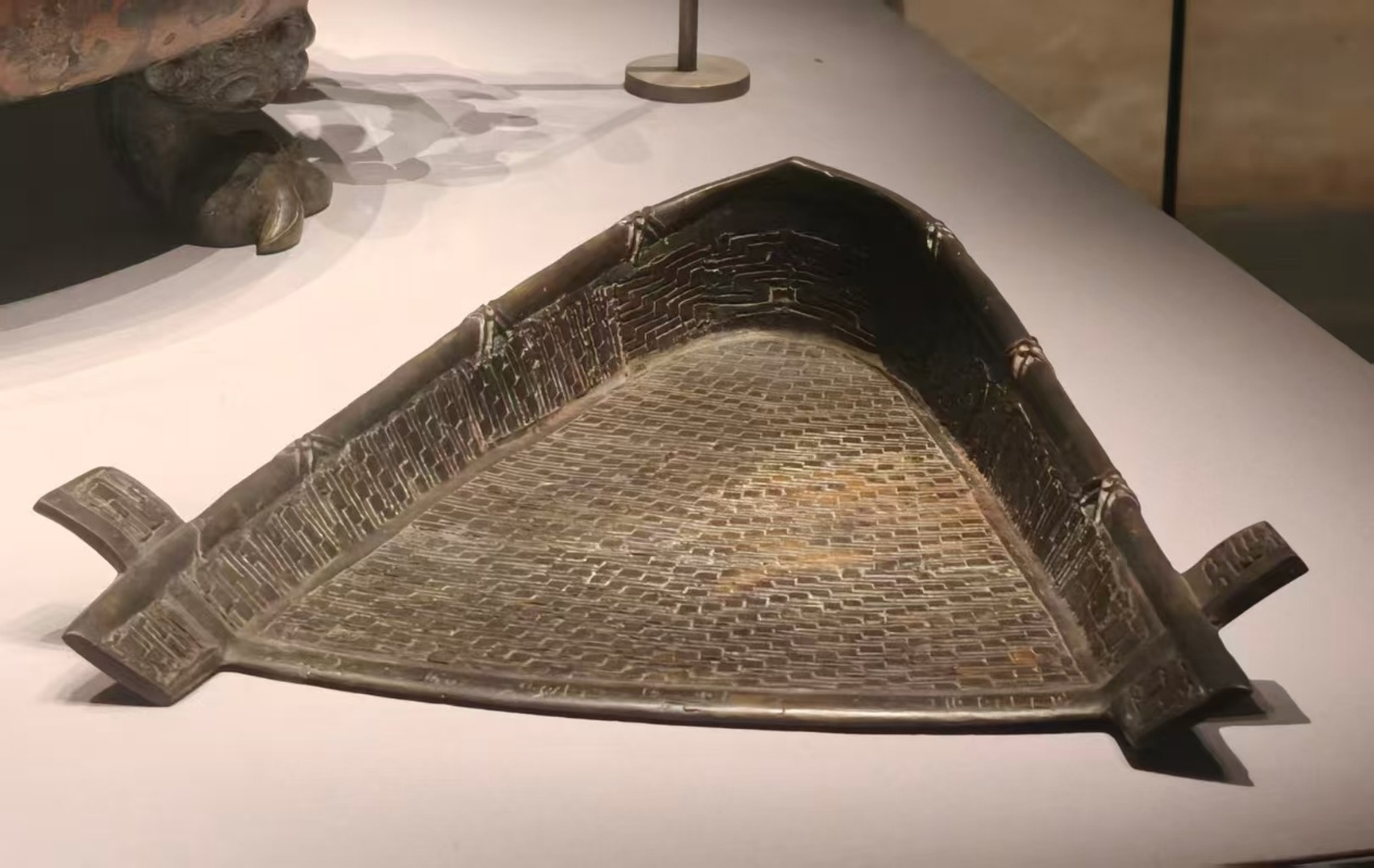 看完了“简读中国”展览,老师和同学们又来到了曾侯乙展馆。“这件青铜簸箕的造型,正是甲骨文中‘其’字字形的来源。”王统尚老师结合实物,为同学们讲解甲骨文字形与器物之间的关联。同学们在老师的带领下,了解铜鉴缶的用途、二十八宿的天文知识、九鼎八簋和编钟编磬的礼乐制度,同学们还积极地用“古文字摹写训练”和“古代汉语”课程所学的古文字知识来识读衣箱、镈钟、鼎、簋、盉等器皿上的古文字。同学们对比古文字与今字的笔形差异,在真实的文物中深化了对古文字的理解。
