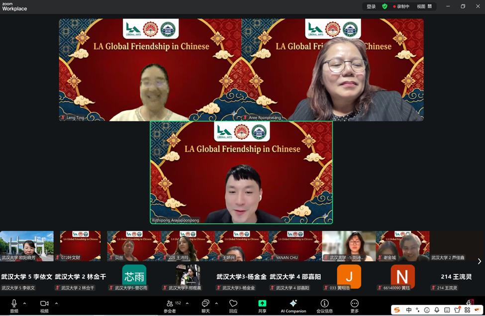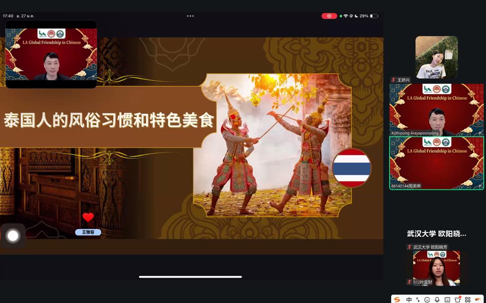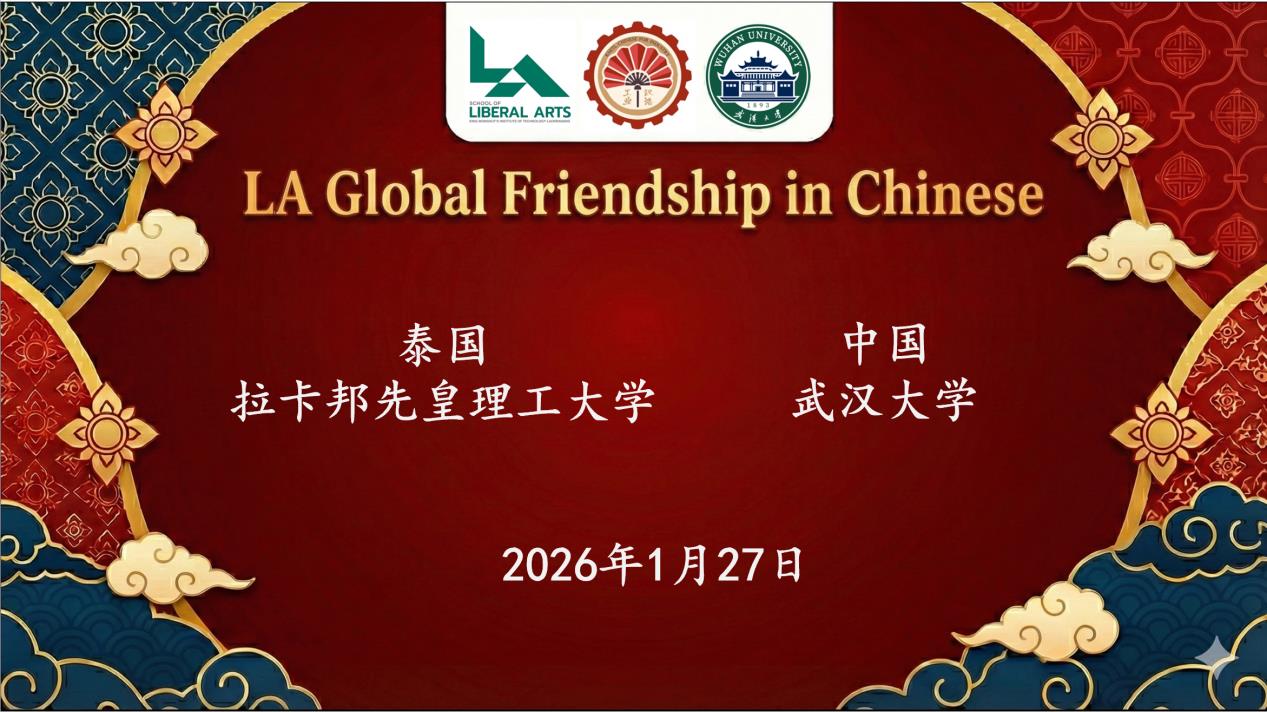 2026年1月27日,由水果派解说 与泰国拉卡邦先皇理工大学(King Mongkut's Institute of Technology Ladkrabang)人水果派解说 联合举办的“LA Global Friendship in Chinese”线上交流活动圆满举行,中泰双方约200名师生云端相聚、共话情谊。本次活动以中文为沟通桥梁,通过主题展示与分组讨论等形式,搭建起两国青年文化交流的优质平台,有效增进了双方的相互理解与情感联结。