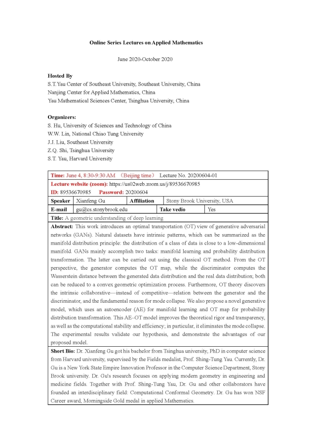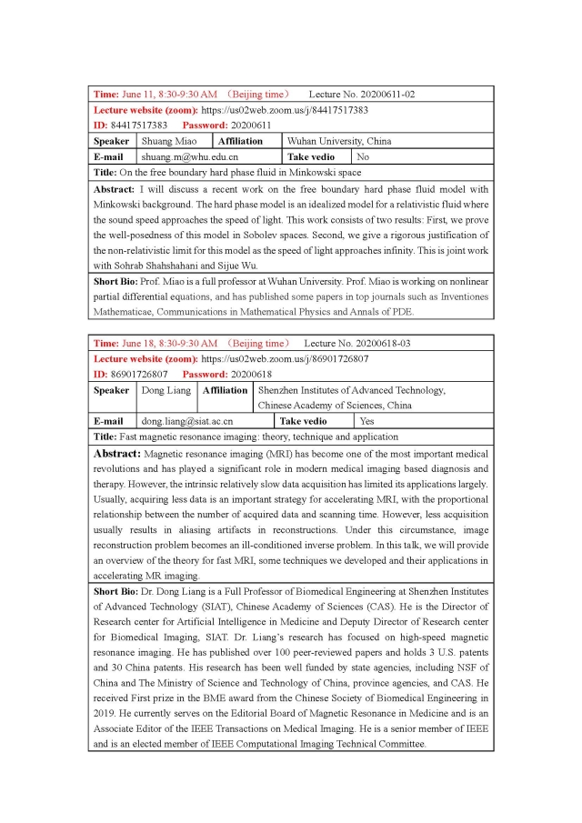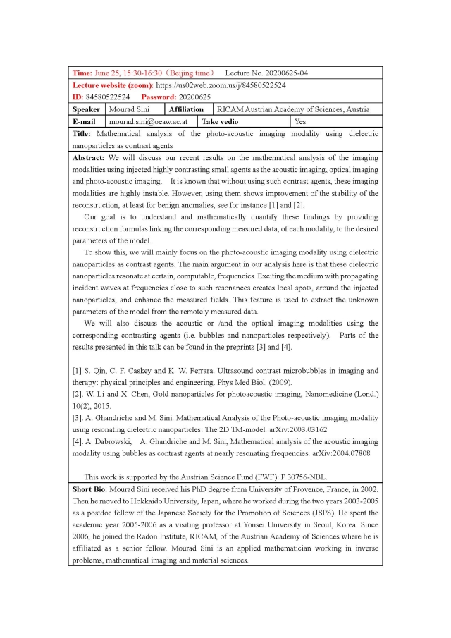 Lectures:June-October,2020,Stony Brook University, USA-Xianfeng Gu,Wuhan University, China-Shuang Miao,Shenzhen Institutes of Advanced Technology-Dong Liang,RICAM Austrian Academy of Sciences, Austria-Mourad Sini