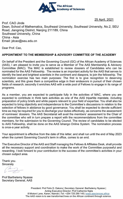 On April 25, the African Academy of Sciences (AAS) invited Professor Jinde Cao to serve as a Member of The AAS Membership and Advisory Committee (MAC). The MAC is established to review dossiers of Candidates who can be nominated for the AAS Fellowship.